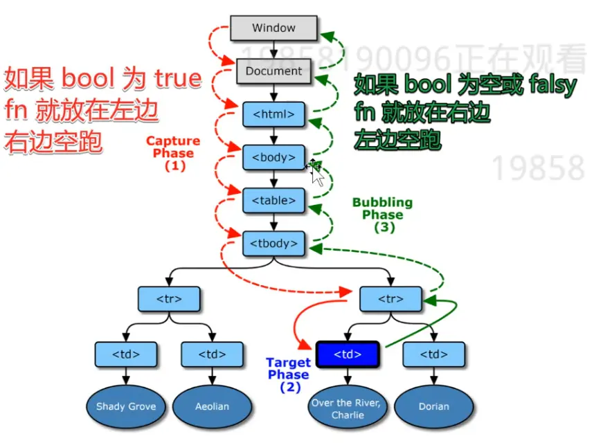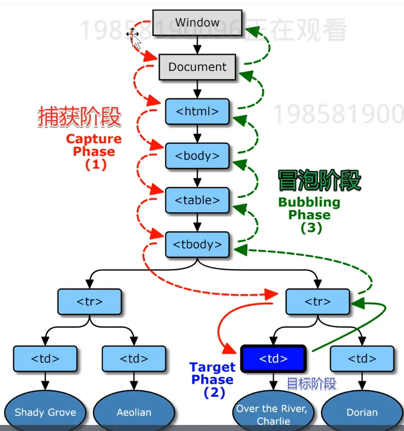 2002年 “和事佬” W3C 颁布标准 同时支持两种方式用函数。首先,从外到里,再从里向外。如果有监听函数就调用,提供事件信息,没有就跳过。