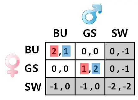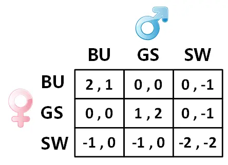 男女双方想要约会去看电影,此时电影院正在上映三部电影:《谍影重重》(The Bourne Ultimatum),《特工风云》(The Good Shepherd),《白雪公主》(Snow White and the Seven Dwarfs)。男方更偏好于《特工风云》,女方则更偏好于《谍影重重》,两方都不喜欢《白雪公主》,希望他们能够选择一起去看电影,否则不会有收益。如果你觉得两方可以协调去看白雪公主,emmmm,祝你幸福! 具体博弈收益如下图所示: