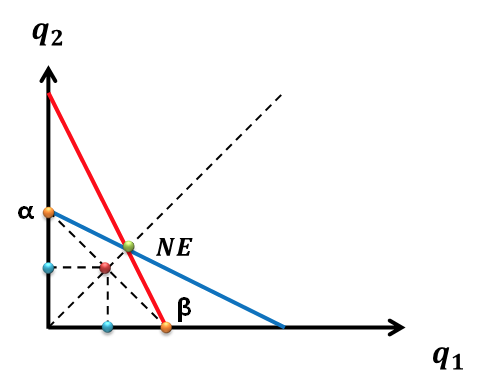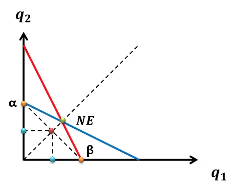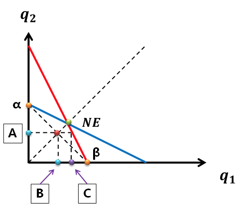 为什么两个公司不各生产垄断产量的一半(两点如上图 α,β 两点连线的中点(红色的点)所分别对应的产量(水蓝色的点)),以使得行业利润最大化呢?