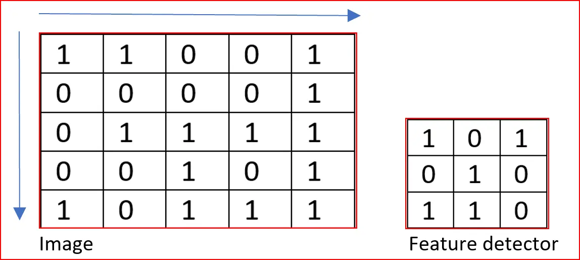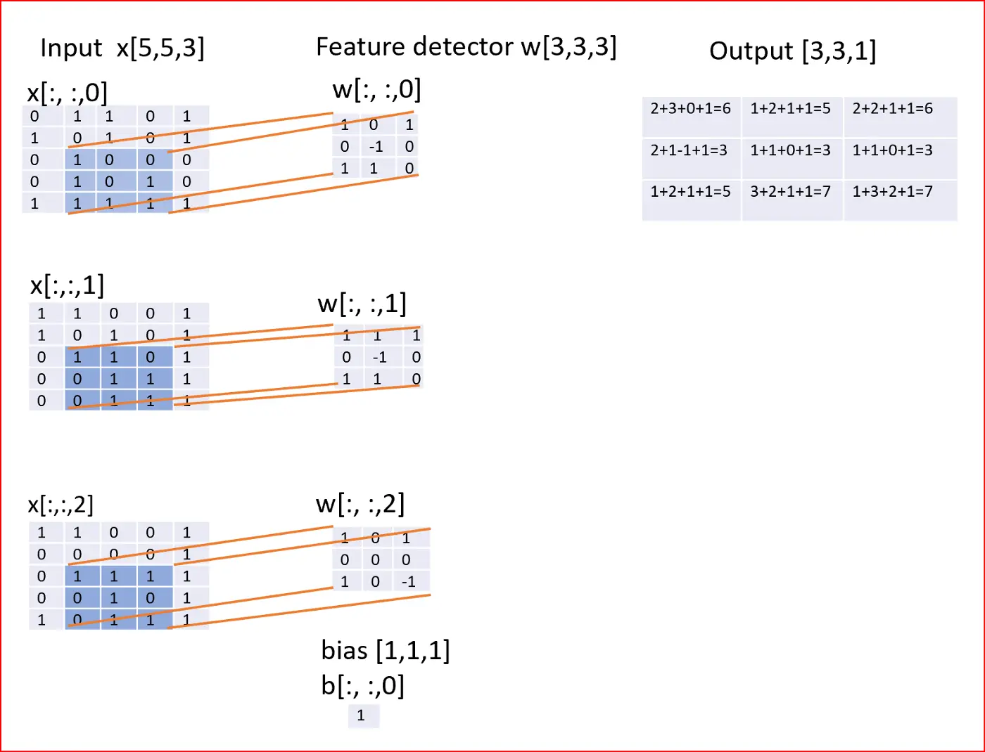 让我们取一幅3通道5×5矩阵的图像(RGB), 3通道3×3的特征检测器(RGB),然后以步长为1来扫描图像上的特征检测器。