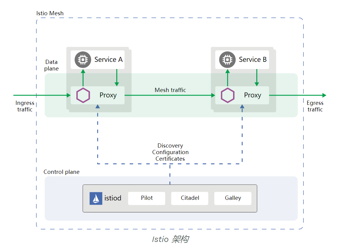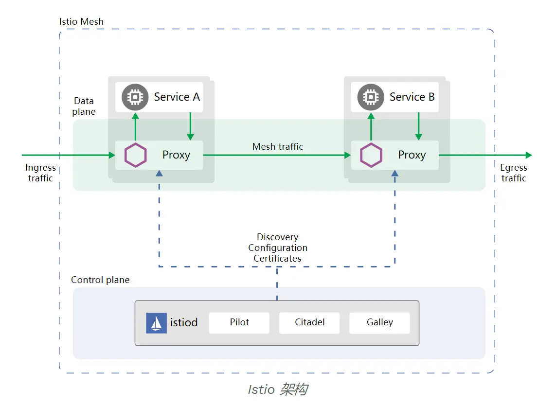 1.6版本后整个控制层的组件现在就剩下istiod了,里面包括polit, citade, galley的功能,目前istiod用这个来替换之前那些组件是为了让服务更加清晰和简单,因为目前来说控制层基本就是作为一种配置下发了,之前的mix的遥测还有策略都被移到envoy中了