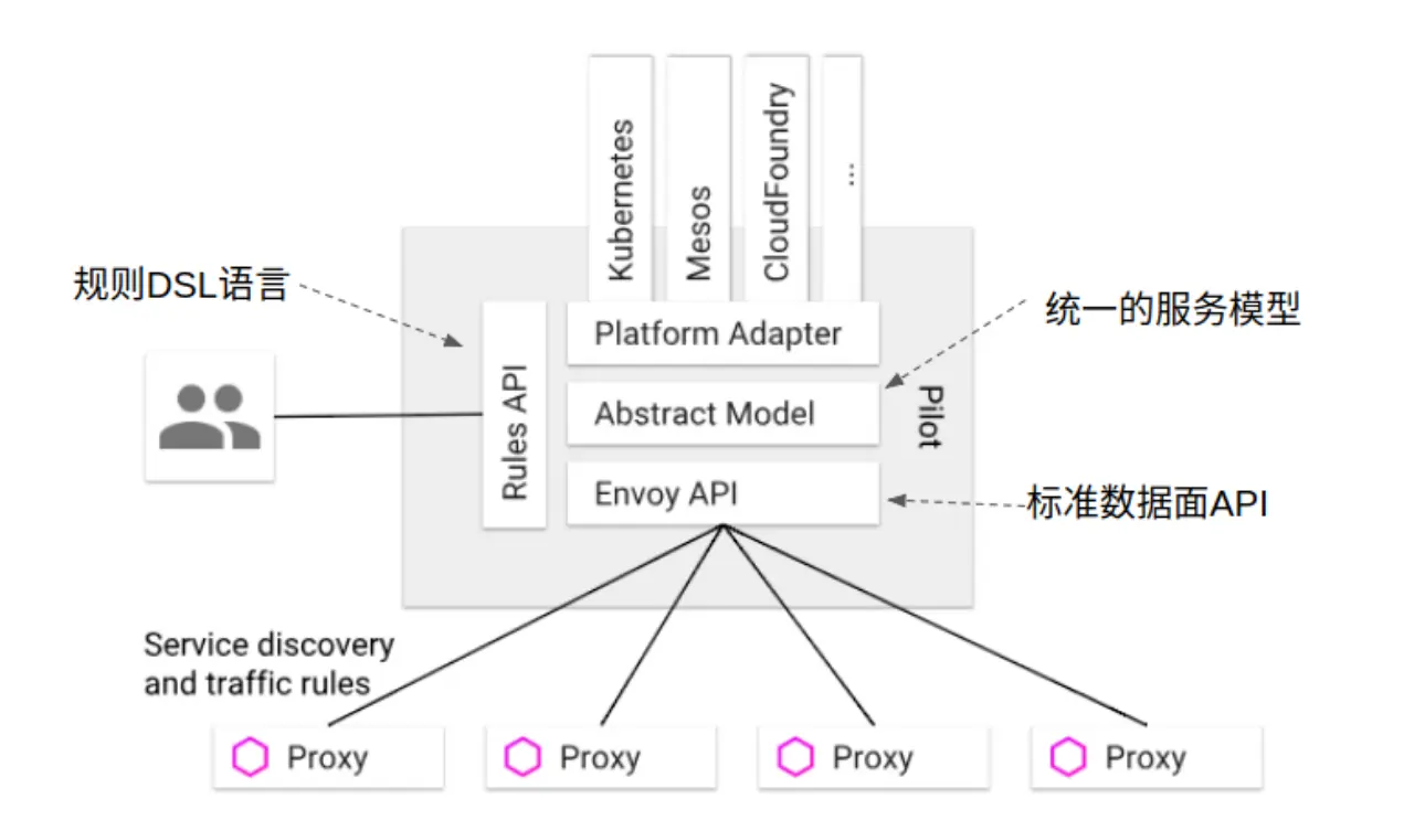 整体架构就是平台适配器拉去各个平台的模型转化为统一的抽象模型(适配器模式)然后用户api进行配置一些规则,会通过envoy api将这些规则下发到对应的容器中