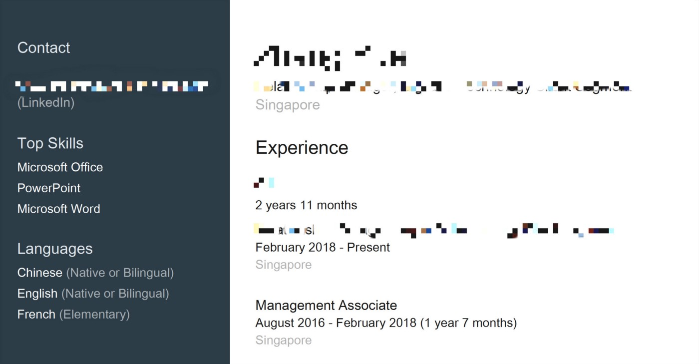 使用PDF Miner的一个缺点是,在处理简历时,简历的格式类似于Linkedin的简历,如下所示。