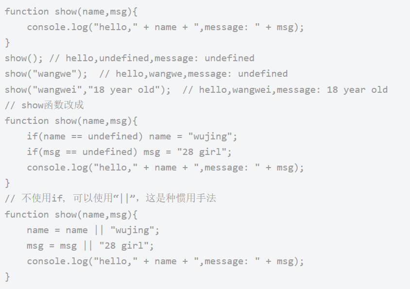 当实参比形参的个数要少时,剩下的形参都将设置为undefined值;为了让实参与形参保持较好的适应性,有必要为可选形参设置一个合理的默认值;如: