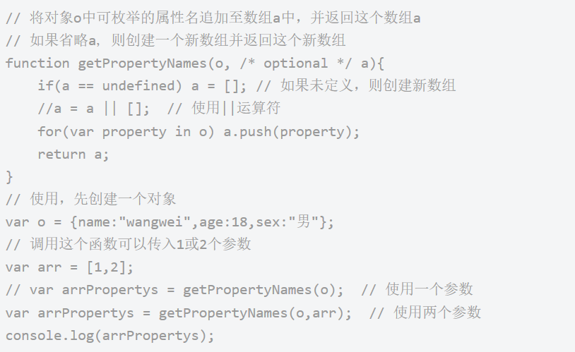 说明:在某些时候,没有必要检查实参的个数,因为JS的默认行为是可以满足需要的,如省略的实参都是undefined,多出的参数自动省略。