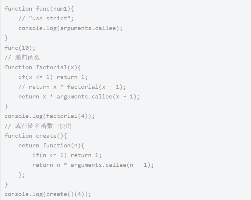 callee属性指向当前正在执行的函数,在某些时候非常有用,如在一个匿名函数中使用递归;但在严格模式下会抛出错误,所以,尽量避免使用callee属性,可以为函数明确定义一个名称;