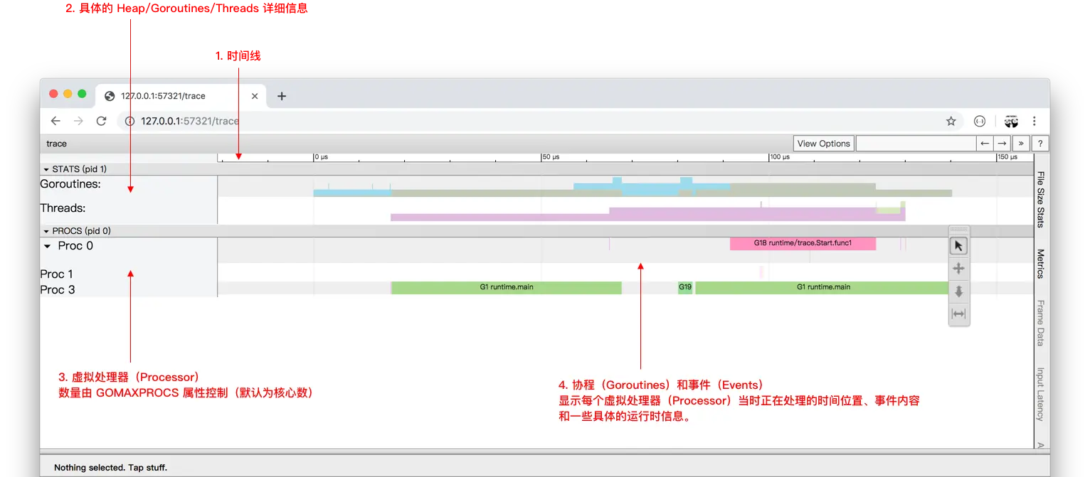 - 协程和事件:显示在每个虚拟处理器上有什么 Goroutine 正在运行,而连线行为代表事件关联。