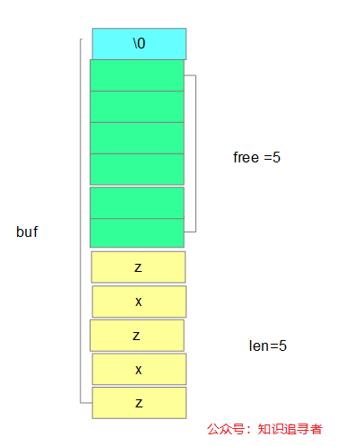 更加的形象的一个存储图像如下 buf 中的实际大小为 11(len + free + 1),其中已经使用空间 len = 5 , 未使用空间 free=5; 保留位空字符 \0 占一位;当我们在redis储存进一个字符串zxzxz 的时候 就已经给我们分配好了内存空间,以及后面能用使用的内存空间;如果是c 语言那么要得到一个 zxzxz 字符长度就需要遍历整个字符数组 遇到 \0 (C语言以\0区分内存空间中的字符串)后结束,才计算出一个字符串的长度,然而redis只需要一个sdslen(非c语言读者不必纠结此类API) 就可以计算得出字符串长度; 从算法角度来看 redis 的一次获取字符串长度 为 O(1), c 语言 为 O(N), 所以redis 快很多;