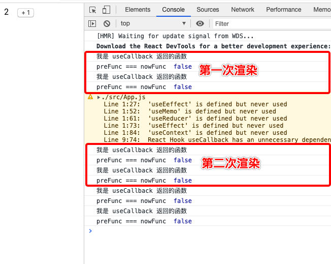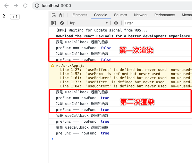 代码的思路是比较本次渲染和上次渲染,useCallback 返回的函数是否为同一个函数。从结果可以看出,本次渲染和上次渲染,useCallback 返回的是同一个函数。useCallback 接受 2 个参数,第一个参数是函数,第二个参数是数组,返回一个函数,当传入空数组时,useCallback 在每次渲染时返回的函数是相同的。数组中也可以有依赖项,只有本次渲染和上次渲染,依赖项的值未发生改变,useCallback 返回的才是同一个函数,一旦依赖项的值发生改变,useCallback 将会返回一个新的函数,下面通过代码了解这一点。