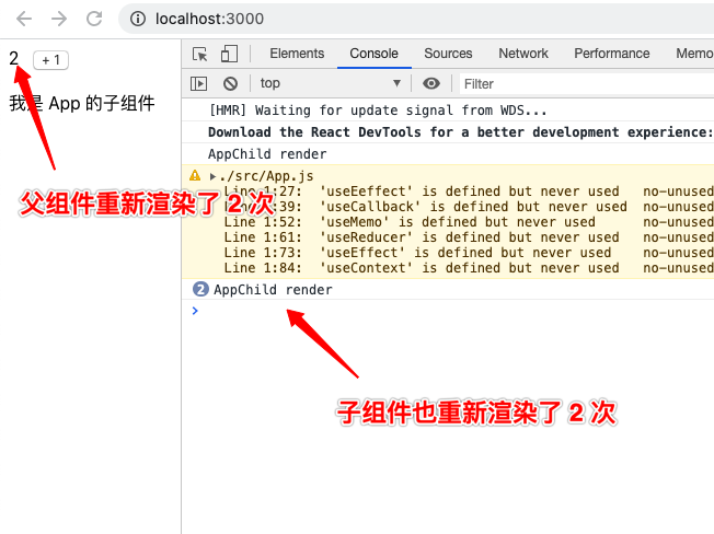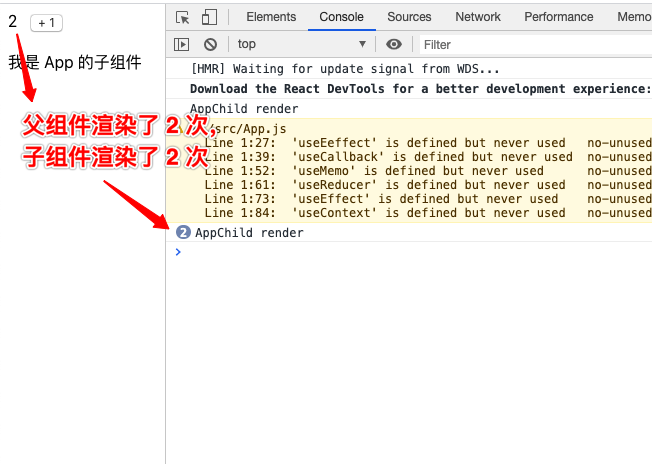 从图中可以看出,父组件 App 的数据发生变化,导致父组件重新渲染,导致子组件 AppChild 重新渲染,然而子组件的数据并没有发生变化,子组件的重新渲染造成性能浪费。
