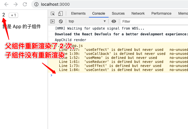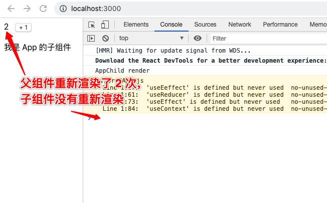 子组件 AppChild 通过 useContext 获取 context 的值,当 context 的值发生变化时,从图中可以看出,React.memo 也无法阻止子组件 AppChild 的重新渲染。