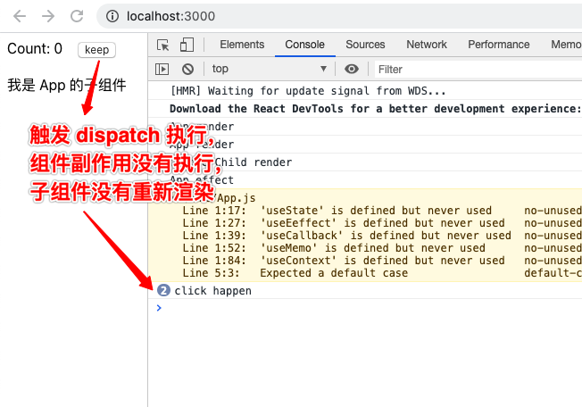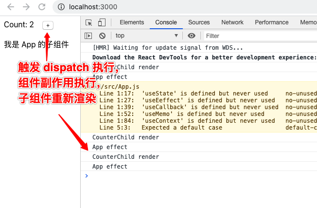 从结果中可以看出,dispatch 执行,App 的副作用没有执行,App 的子组件 AppChild 没有重新渲染,dispatch 执行,引起组件副作用执行和子组件重新渲染的条件是,reducer 函数返回的结果与上一次返回的结果不同。可以发现,执行 dispatch,App 也没有重新渲染,但是这是不确定事件,App 仍然有可能渲染。