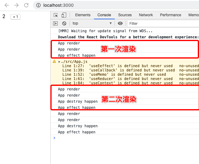 参数函数可以返回一个函数,这个函数称为清除函数,从结果可知,在首次渲染时,参数函数会在组件渲染后执行,重新渲染时,先执行清除函数,再执行参数函数。在这段代码中,没有给 useEffect 传入第二个参数,在下段代码中,给 useEffect 传入空数组。