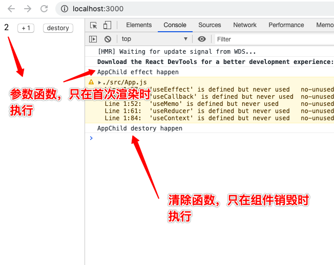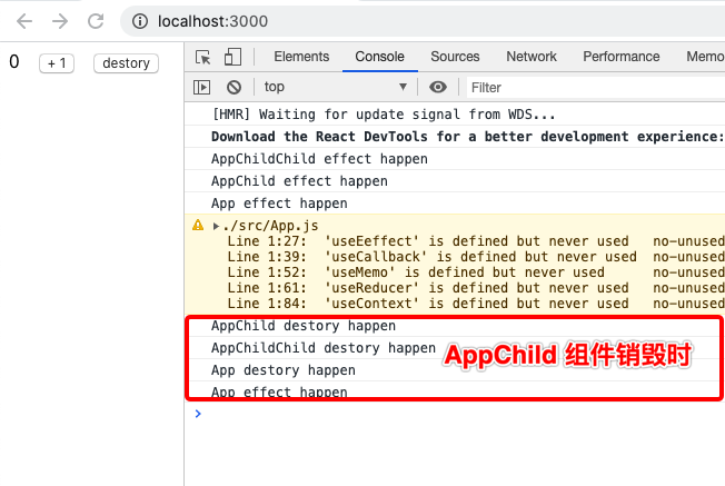 通过结果可知,每次渲染,子组件 useEffect 中的参数函数先于父组件的执行。当组件树销毁时,组件树中组件清除函数的执行顺序通过下面一段代码了解。