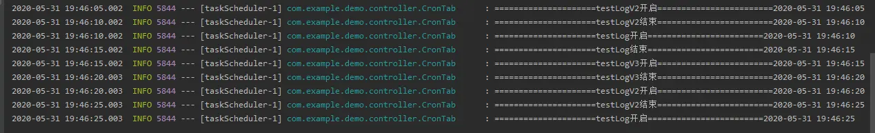 2020-05-31 19:41:57.002 INFO 500 --- [taskScheduler-1] com.example.demo.controller.CronTab : ===testLog开启===2020-05-31 19:41:57