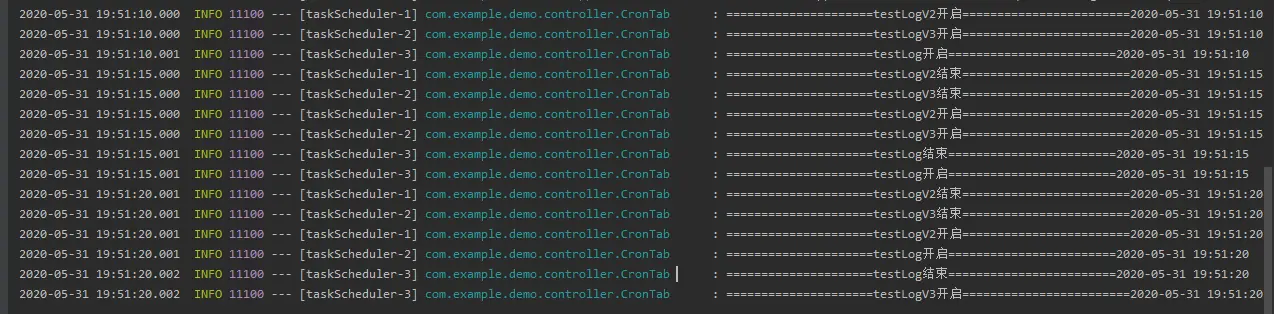 2020-05-31 19:41:45.000 INFO 500 --- [taskScheduler-1] com.example.demo.controller.CronTab : ===testLog开启===2020-05-31 19:41:45