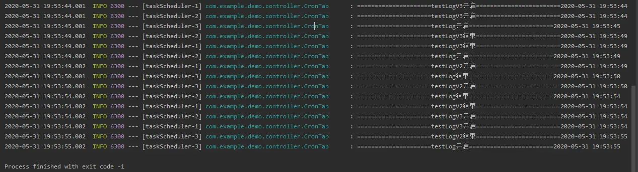 2020-05-31 19:41:57.002 INFO 500 --- [taskScheduler-1] com.example.demo.controller.CronTab : ===testLog结束===2020-05-31 19:41:57