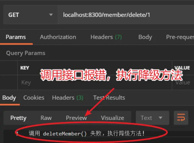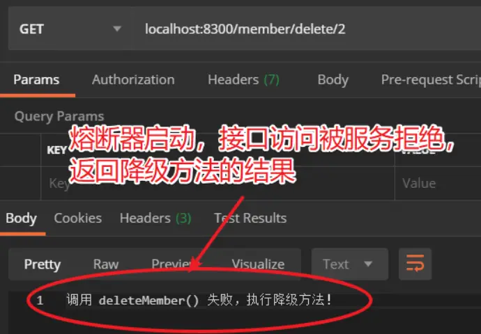 - 调用 localhost:8300/member/delete/2,传入参数不为:1,接口不会报错;发现熔断器启动,接口都是返回降级方法的返回结果