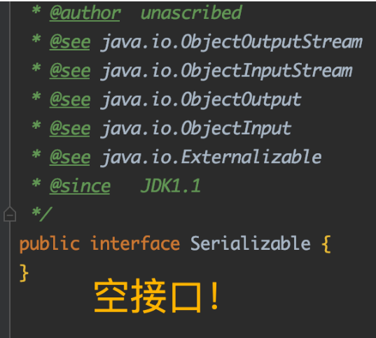 上面在定义Student类时,实现了一个Serializable接口,然而当我们点进Serializable接口内部查看,发现它竟然是一个空接口,并没有包含任何方法!
