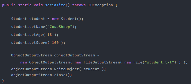 public static void serialize( ) throws IOException { Student student = new Student(); student.setName("CodeSheep"); student.setAge( 18 ); student.setScore( 1000 ); ObjectOutputStream objectOutputStream = new ObjectOutputStream( new FileOutputStream( new File("student.txt") ) ); objectOutputStream.writeObject( student ); objectOutputStream.close(); System.out.println("序列化成功!已经生成student.txt文件"); System.out.println("==============================================");}