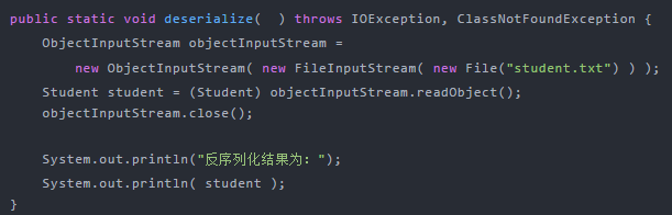 public static void deserialize( ) throws IOException, ClassNotFoundException { ObjectInputStream objectInputStream = new ObjectInputStream( new FileInputStream( new File("student.txt") ) ); Student student = (Student) objectInputStream.readObject(); objectInputStream.close(); System.out.println("反序列化结果为:"); System.out.println( student );}