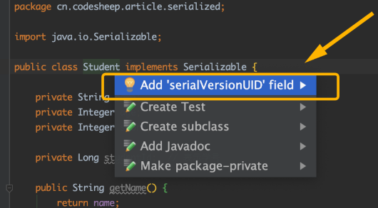所以,为了serialVersionUID的确定性,写代码时还是建议,凡是implements Serializable的类,都最好人为显式地为它声明一个serialVersionUID明确值! 当然,如果不想手动赋值,你也可以借助IDE的自动添加功能,比如我使用的IntelliJ IDEA,按alt + enter就可以为类自动生成和添加serialVersionUID字段,十分方便: