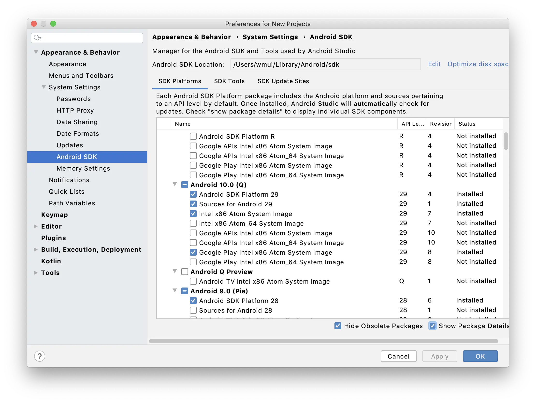 查看方式是:启动 Andriod Studio 》点击右下角 configure》选择 SDK Manager。