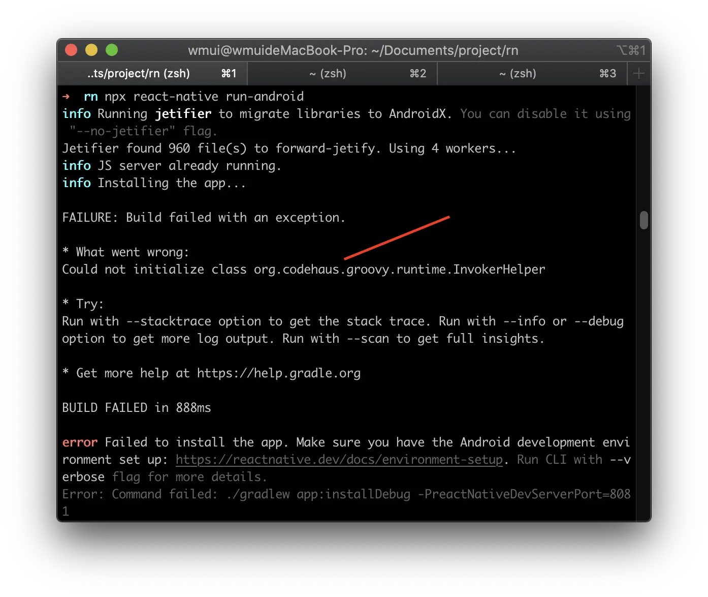 由于包比较大,安装比较耗时间。以上都安装完成后,在项目目录下执行 npx react-native run-android,惊喜来啦,出现了新的错误。。。