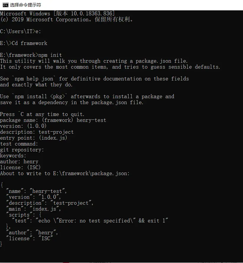 cmd命令框执行npm init(也可以执行npm init -y,会跳过一些默认项),执行成功后会在当前文件夹默认创建package.json文件