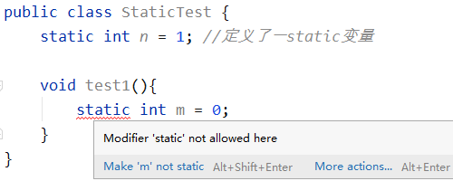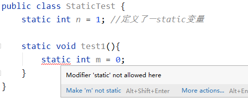 从上图可以看到,很明显不能在方法中定义static变量,即使给方法加上static也不行。