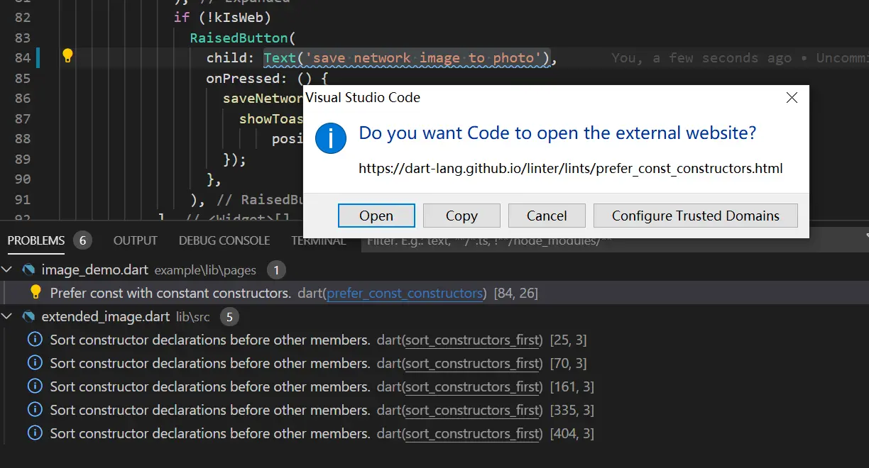 说了那么多,我们自己来试一下,怎么操(受)作(虐)。把analysis_options.yaml复制到项目下面之后,应该会在VSCode下面的PROBLEMS下面/Android Studio在Dart Analysis下面看到提示。
