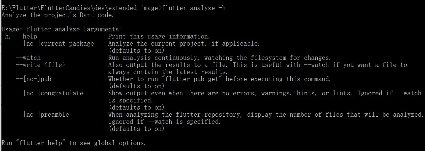 在终端中执行flutter analyze -h,可以看到下面提示。可以看到大部分命令默认是开启的。