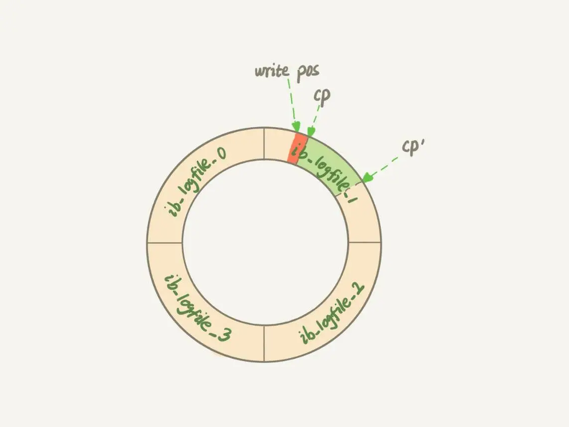 write pos是数据操作记录加载进的位置,该位置表示数据操作记录源源不断的写入到了log files,但是还没有进行对比确定成为正真的干净页。当数据写入到ib-logfile-3之后,又会从ib-logfile-0重新写入。形成一个链式循环。从write pos到checkpoint的空间表示可存储空间。