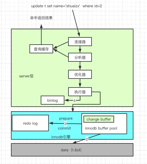 - 若innodb buffer pool中有相应缓存的值,则读取到执行器中,更新name="shuaizx",在更新到innodb buffer pool中