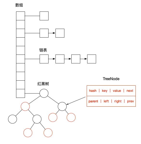 而TreeNode是在链表长度大于一定程度时,在链表转换成红黑树结构时使用的存储节点,其除了Node的四个属性外,还持有其parent、left、right和prev节点的引用(还有LinkedHashMap.Entry的before和after)。下图就是HashMap以数组 + 链表 + 红黑树的形式保存数据的示意图。