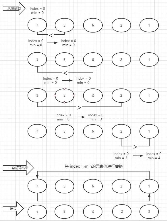 > 核心思想是,从左往右,找出最小的元素值对应的索引`min`,与需要替换的值进行替换
