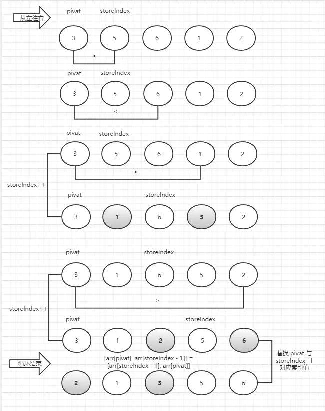 storeIndex指针对应的值替换,并且让storeIndex往右移(++) - 直到数组已经循环完毕后,
