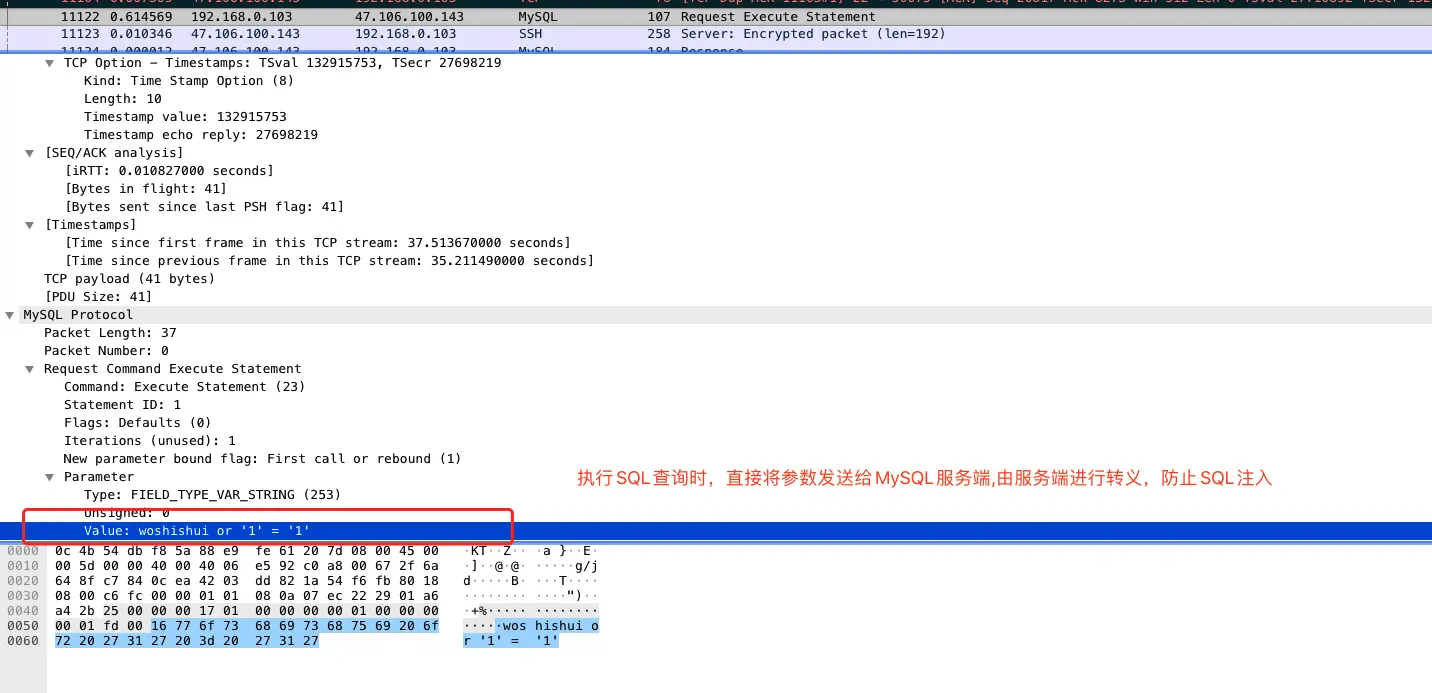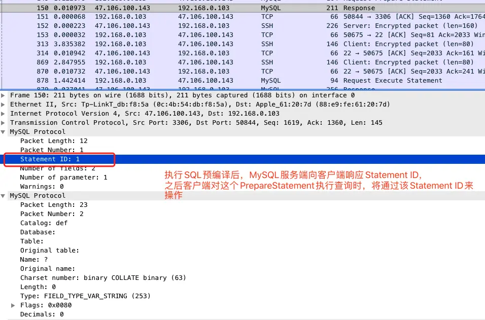我们通过wireshark抓包可以看出,当执行 connection.prepareStatement 时,客户端会向服务端发送预编译SQL的请求命令,之后由服务端进行预编译处理后,返回一个 Statement ID ,之后客户端将通过传递这个 Statement ID 和参数组来执行SQL。