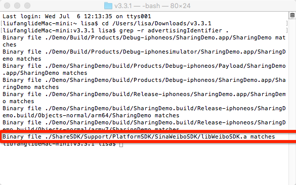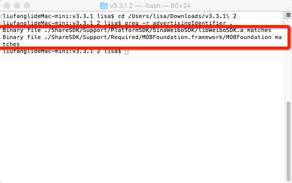结果:可以检查出ShareSDK自带的MOBFoundation.framework和新浪微博SDK都使用了IDFA。