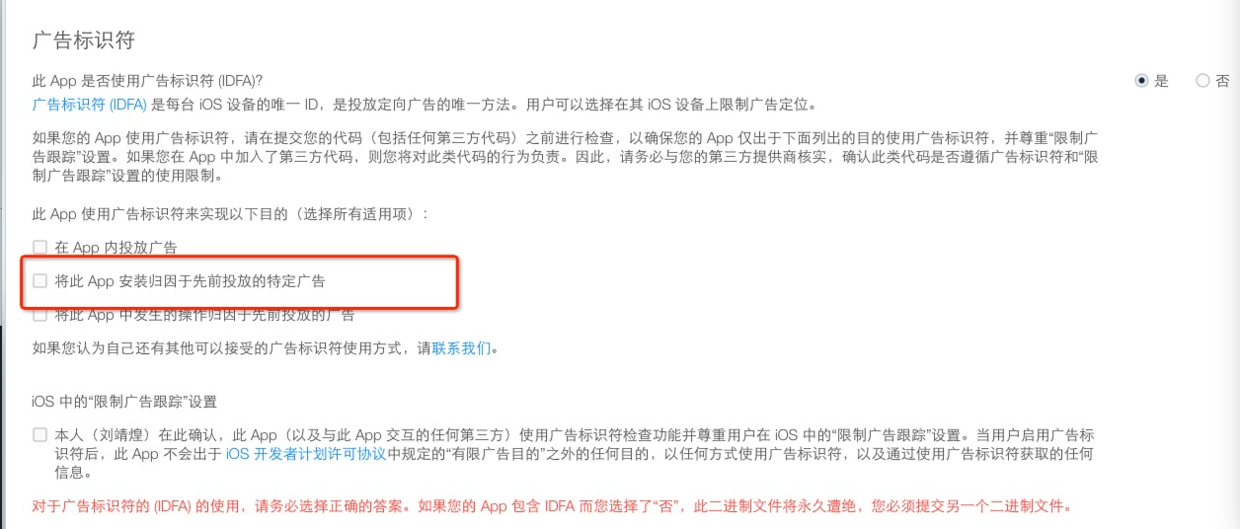 这一项下的内容其实就是对你的应用使用 IDFA 的目的做下确认,只要你选择了采集 IDFA,那么这一项都是需要勾选的。