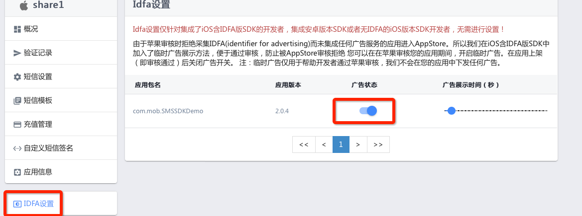 将注册应用后获取到的 Appkey 填入ShareSDK IDFA 版 的初始化中,跑一遍后后台基本就可以出现这个广告状态。(如下图)