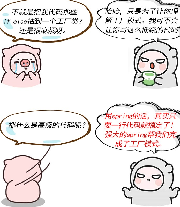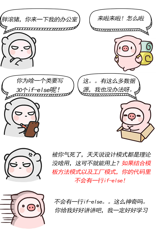 领导胖滚熊也对胖滚猪的效率表示了肯定。可是好景不长,第三天,领导闲着没事,准备做一下code review,可把胖滚熊惊呆了,一个类里面有近30个if-else代码,我滴个妈呀,这可让代码洁癖狂崩溃了。