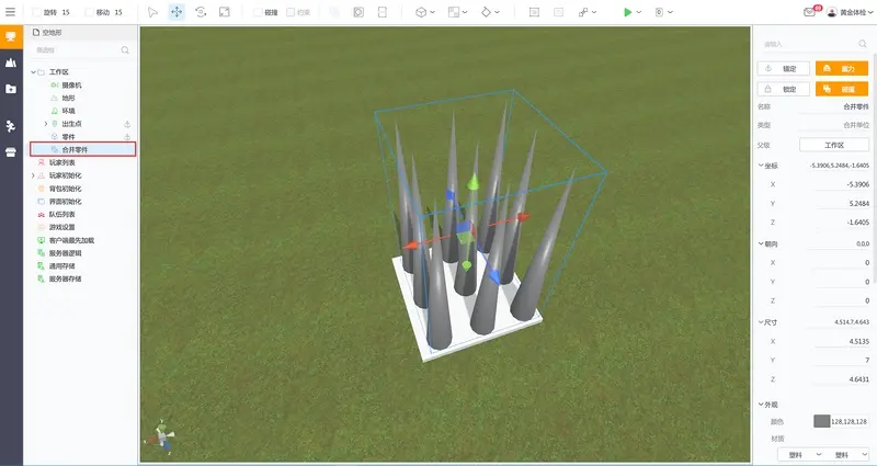 3.取消圆锥体的碰撞,Ctrl+D复制9个圆锥体,调整位置如下图后,选中9个圆锥体零件,合并为一个合并零件。如下图所示: