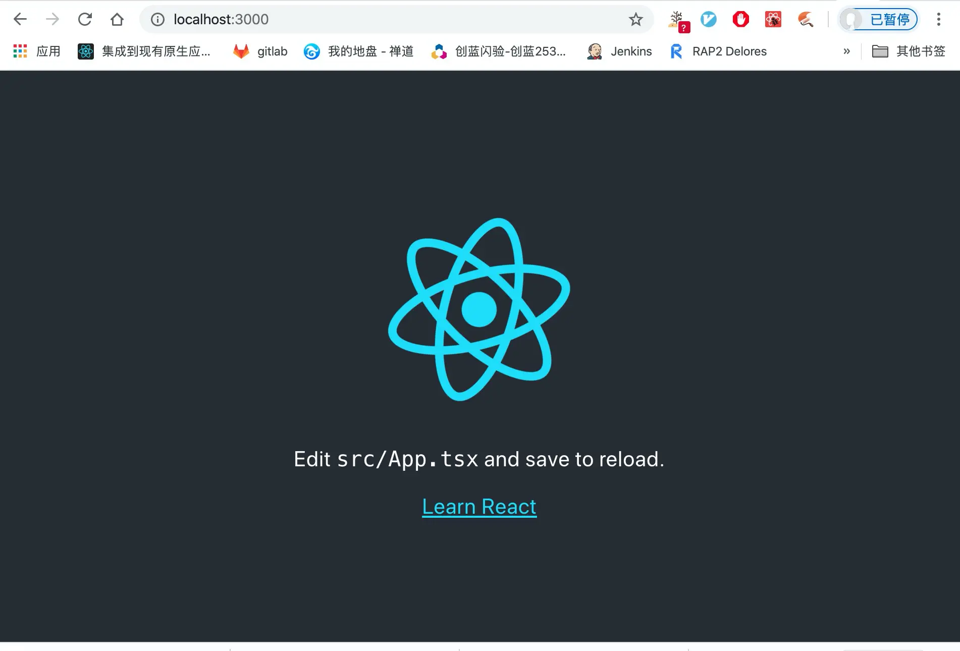 这样我们可以打开我们刚才的创建的项目my-app,并在该项目下执行 npm start,默认的端口号是3000(当你电脑该3000端口被占用了,启动的时候就会自动给你确认是够更换端口,这个时候你可以自行选择了)。这时候就会在打开http://localhost:3000网页。这就是最初cra(下面咱们都用cra来代称create-react-app)帮我们实现的最初的样子