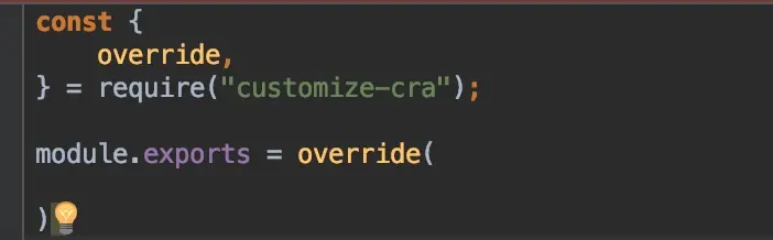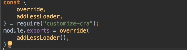 2.安装好后我们在项目的根目录下(和package.json同级目录)新建config-overrides.js文件,首先我导入override函数,因为所需的任何插件调用它。该函数将使用新修改的配置对象进行重写。如下