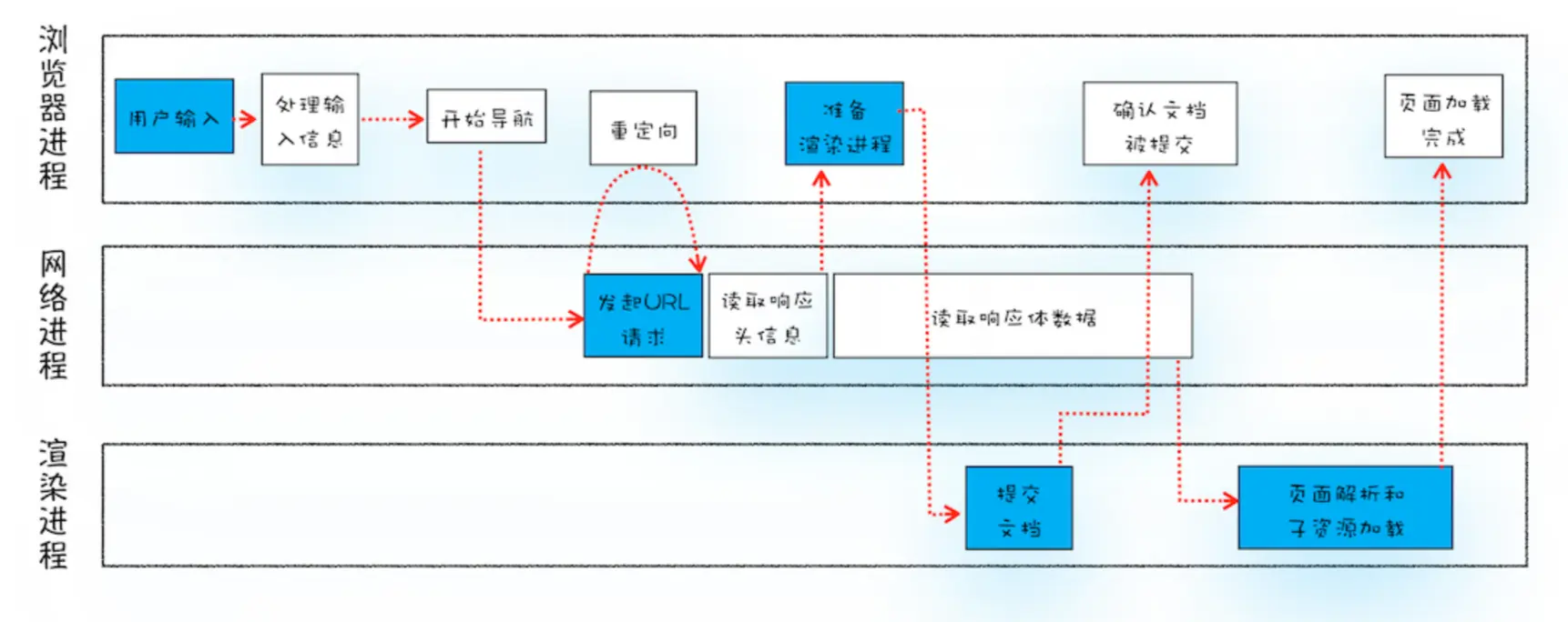 从用户输入信息到页面展示的不同阶段,是不同的进程在发挥作用,示意图如下: