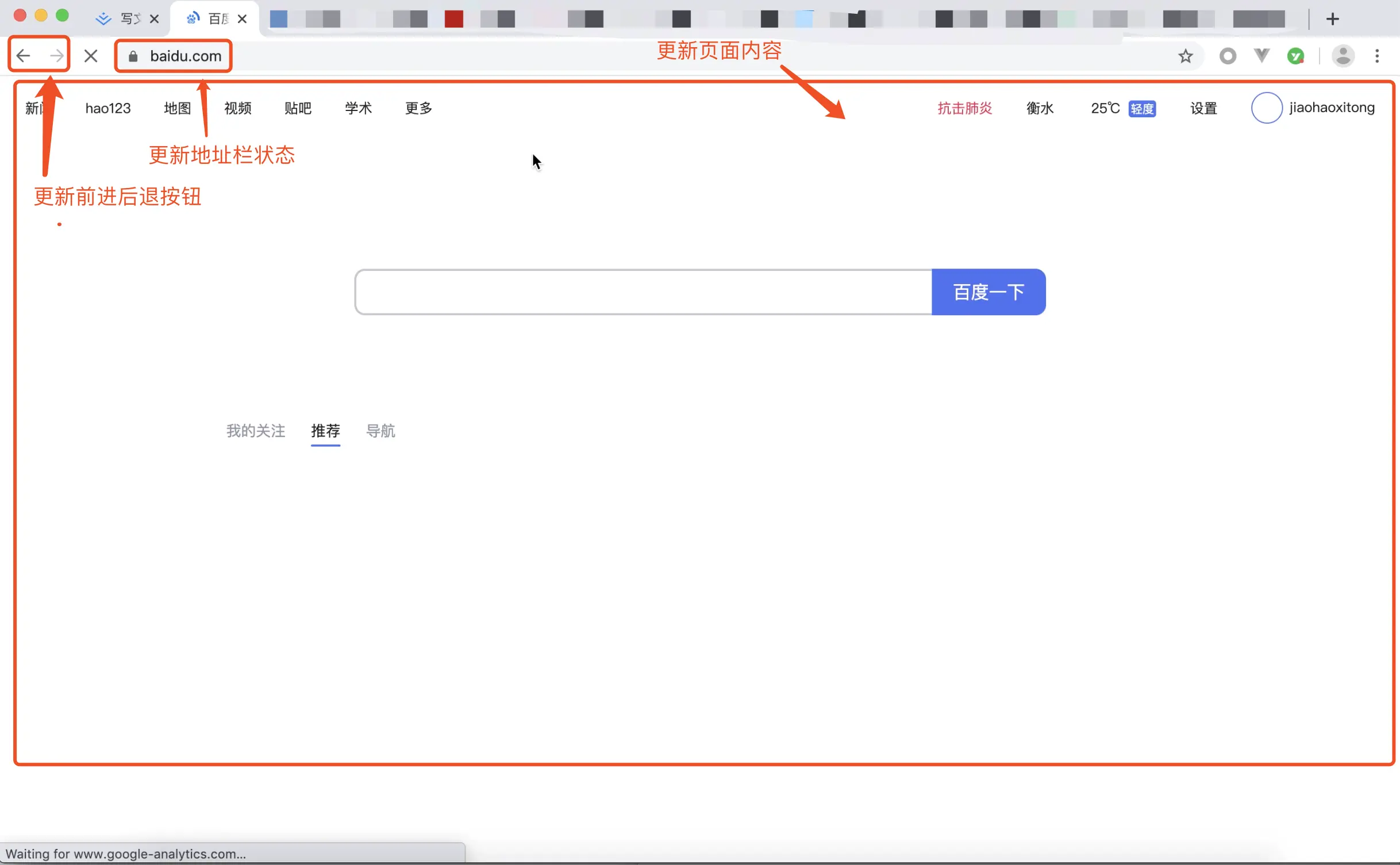 从图中可以看出,当浏览器刚开始加载一个地址之后,标签页上的图标便进入了加载状态。但此时图中页面显示的依然是之前打开的页面内容,并没立即替换为百度首页的页面。因为需要等待提交文档阶段,页面内容才会被替换。