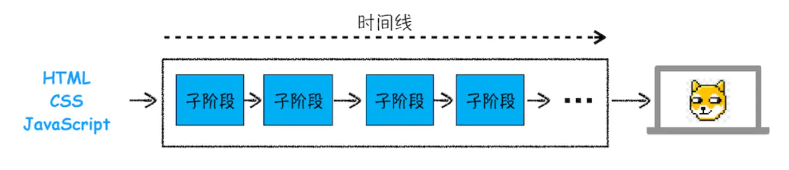 一旦文档被提交,渲染进程便开始页面解析和子资源加载了,一旦页面生成完成,渲染进程会发送一个消息给浏览器进程,浏览器接收到消息后,会停止标签图标上的加载动画,渲染流程大致可以描述为如下阶段: