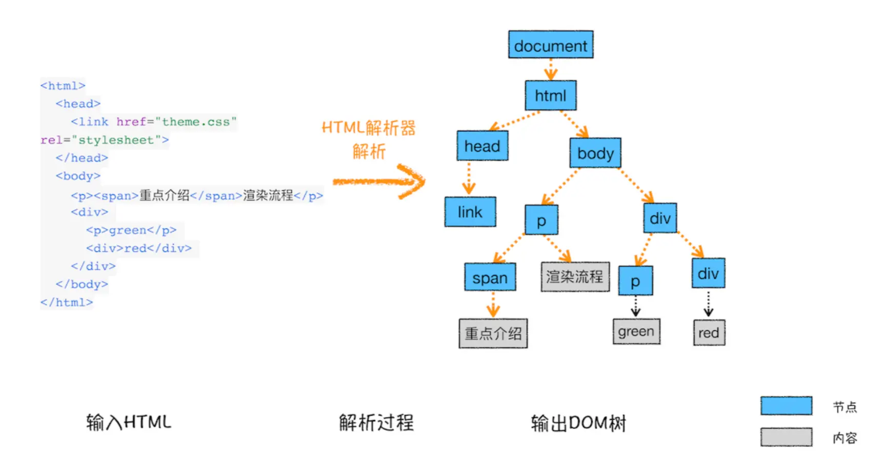 浏览器无法直接理解和使用 HTML,所以需要将HTML 转换为浏览器能够理解的结构—DOM 树,DOM树的构建过程可以参考下图: