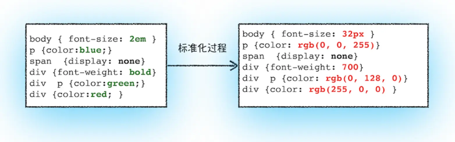 接下来渲染进程就会进行属性值标准化,也就是将所有值转换为渲染引擎容易理解的、标准化的计算值,从下图可以看出,2em被解析成了32px,red 被解析成了 rgb(255,0,0),bold 被解析成了700